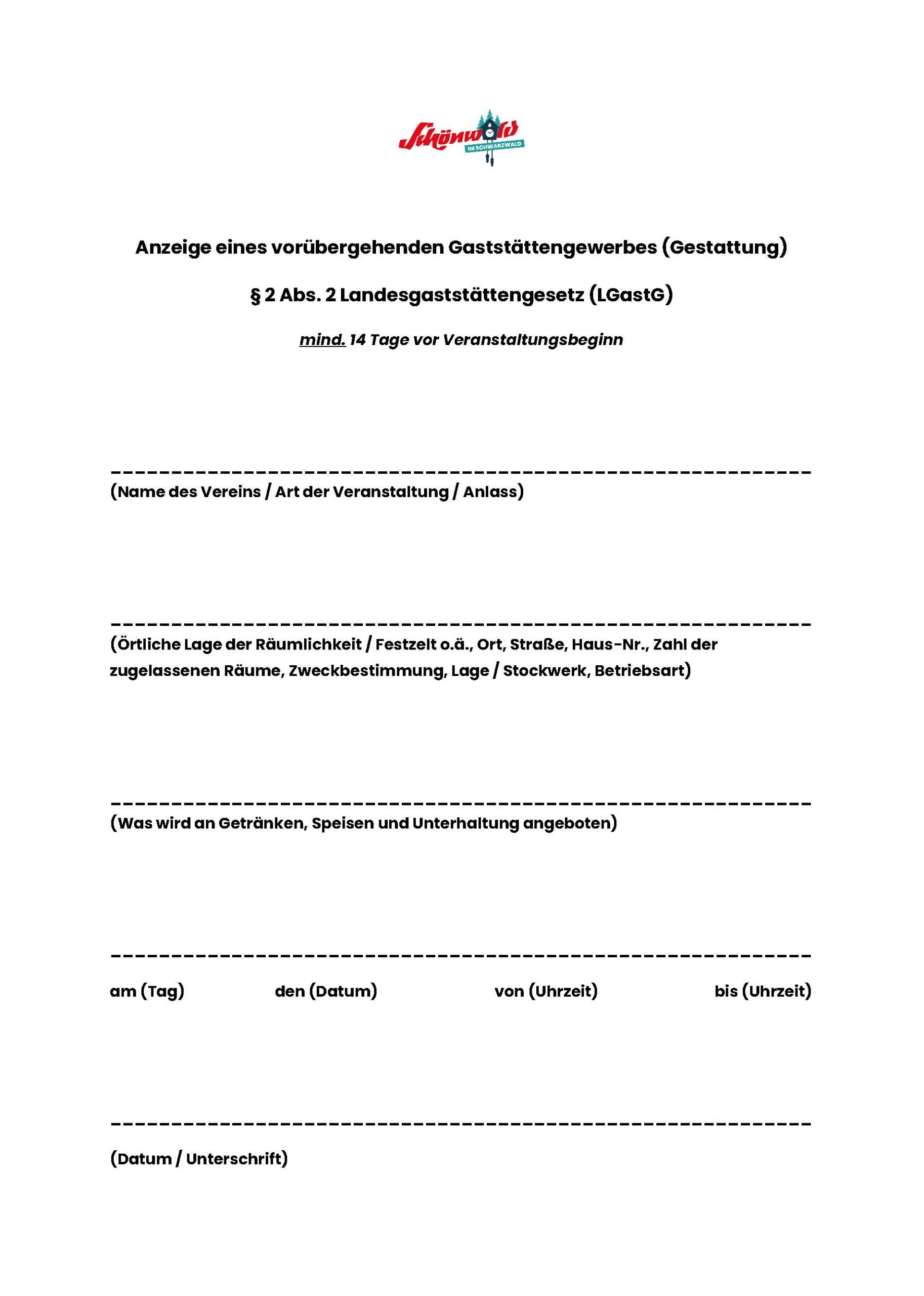 Die Gestattungen müssen nur noch im Rahmen eines Anzeigeverfahrens der Gemeinde mit dem beil. Vordruck mind. 14 Tage vor Veranstaltungsbeginn (eine Fristverkürzung ist nicht möglich) mitgeteilt werden.