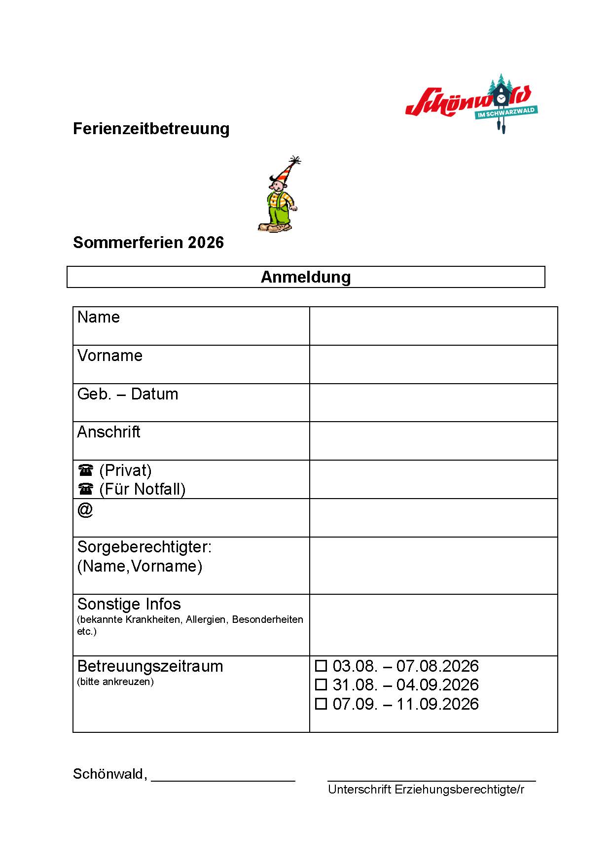 Die Anmeldeformulare müssen bis spätestens 19.06.2026 für eine verbindliche Anmeldung bei der Gemeinde Schönwald vorliegen. Später eingegangene Anmeldungen können leider aus planungstechnischen Gründen nicht berücksichtigt werden oder sind unter Umständen mit erheblichen Mehrkosten verbunden.