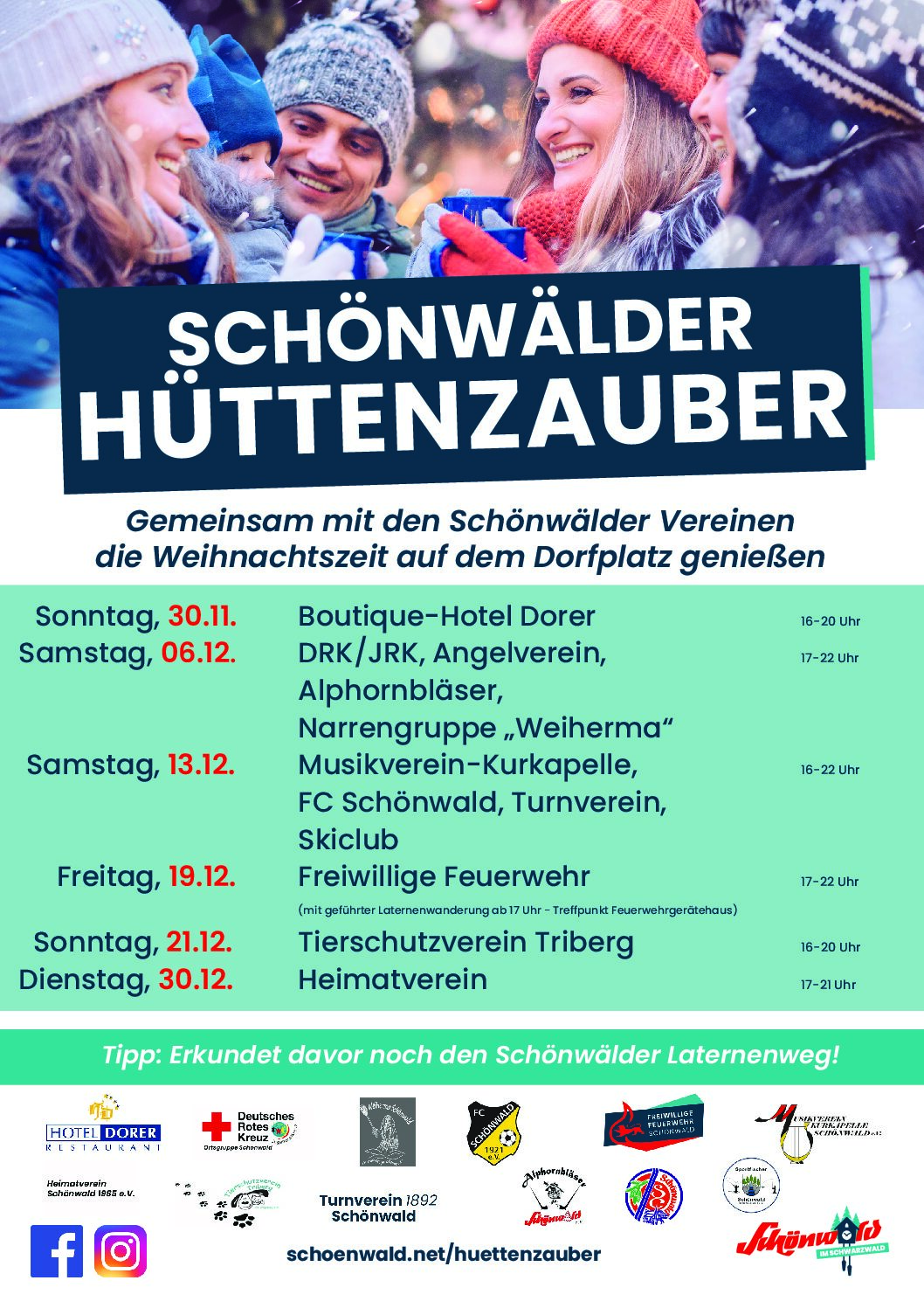 Der Musikverein-Kurkapelle, FC Schönwald, Turnverein und der Skiclub servieren Glühwein, Punsch, Schnitzelwecken, Pommes & Grillwurst und Schupfnudeln.