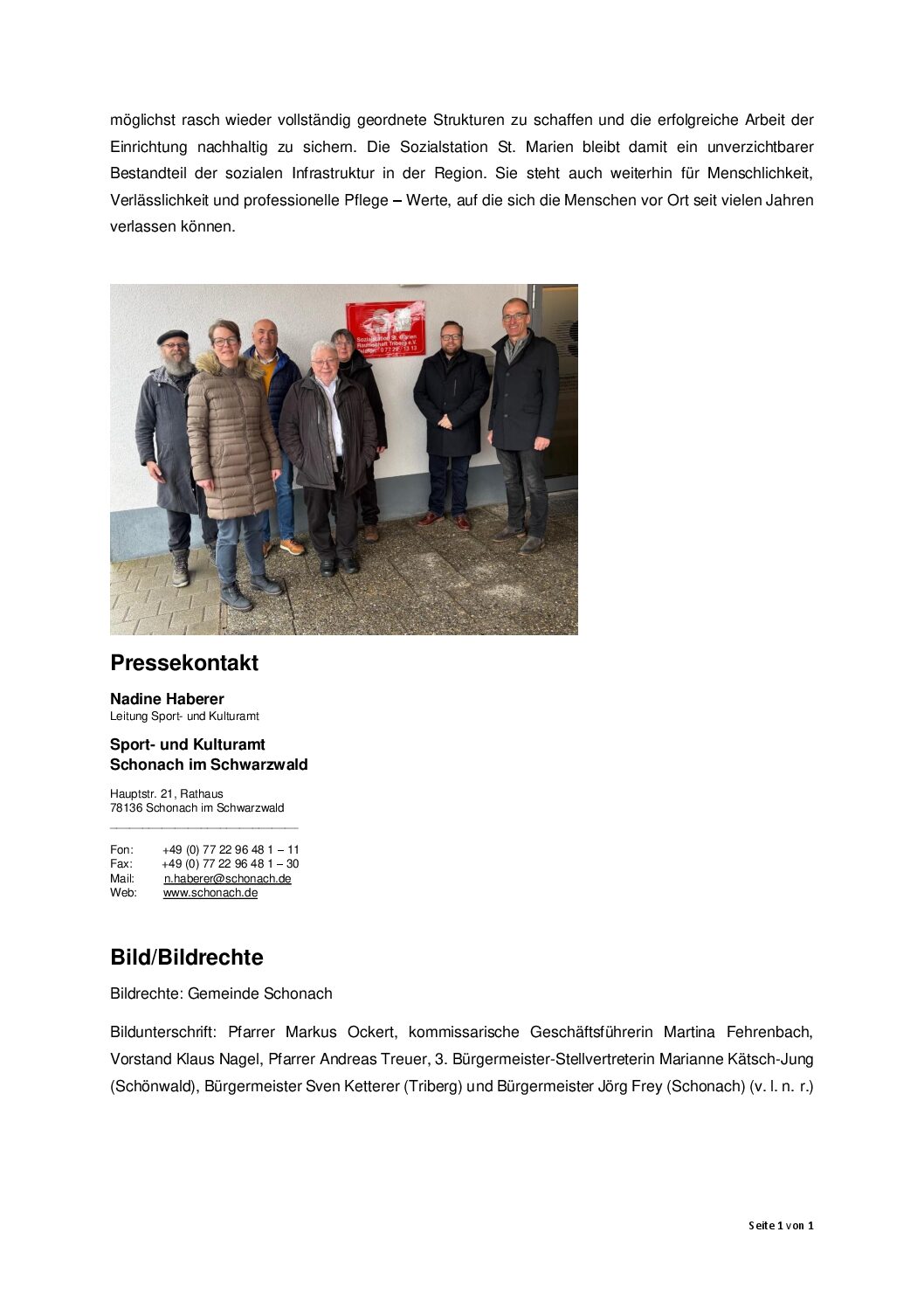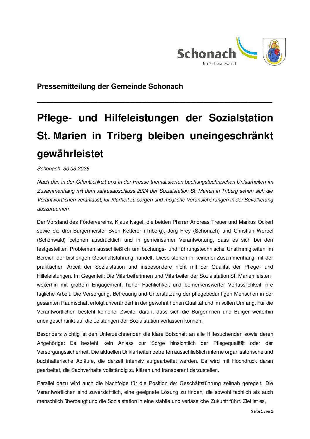Pflege- und Hilfeleistungen der Sozialstation St. Marien in Triberg bleiben uneingeschränkt gewährleistet von Romina Scherzinger | 8. Apr. 2026 | Aktuelles, Relevantes, Stellenangebote Informationen zur BarrierefreiheitTastatursteuerung & SchriftgrößeFehler melden Wetter in Schönwald im Schwarzwald © wetterdienst.de © wetterdienst.de Schneebericht Schönwald Aktuelle Schneelage Schönwälder Webcams Blick auf Schönwald Gemeinde Schönwald im Schwarzwald Heilklimatischer Kurort "Premium Class" und WintersportplatzFranz-Schubert-Straße 3D-78141 Schönwald im Schwarzwald Telefon: +49 7722 8608-0Telefax: +49 7722 8608-34E-Mail: mail@schoenwald.de Facebook Instagram